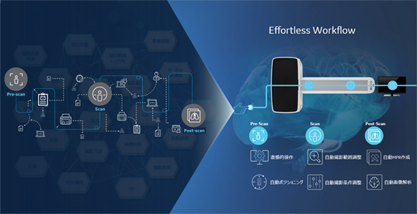 CT検査のPre-Scan,Scan,Post-Scanの各工程において人工知能AI技術ならびに自動化技術を活用し,患者一人ひとりに最適な検査を提供することにより患者さま1人1人に最適な個別化医療を提供します。