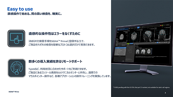 SIGNA™ Primeの最大の特長は,使い手となる医療従事者のMR検査経験や知識に関わらず,精度の高い検査を実施することができる点にあります。MR検査は実施する際に多くのパラメータ調整が必要になり,これは実施する操作者にとって長らくの課題でありました。SIGNA™ Primeは,多忙な先生方が時間をかけず,手軽に使うことができる新しいコンセプトのMRI装置で,新しいユーザーインターフェイスにより,操作の簡易化が大きく進みました。また,新型マグネットや最新デジタル技術TDI,更にはAI技術を搭載し,画質面においても進化しています。シンプルな操作性,環境に優しい設計と将来性豊かなシステム,高機能高画質の全てを兼ね備えているのがSIGNA™ Primeです。