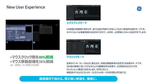 非侵襲な画像診断ができるMR検査をもっと幅広く使用したい。これからの時代に求められる検査だからこそ,SIGNA™ Primeから新しい提案です。それは ,新開発のユーザーインターフェイスに組み込まれている【エクスプレスモード】と【クラシックモード】 。ステップバイステップの手順,簡単なプロトコル選択,ワークフローサポート機能を搭載し,MR検査の学習曲線の平準化を可能にしました。 MR検査の経験値に関わらず,安定的に質の高い画像取得をサポートします。