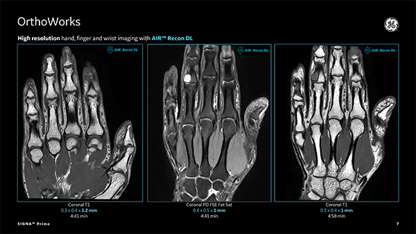 よりシャープに,くっきりと。GEが長年深めてきたMR画像に対する知見を余すところなくSIGNA™ Primeに注ぎ込みました。SIGNA™ Primeは最先端のTotal Digital Imaging(TDI)テクノロジーを搭載。さらに,GE独自のディープラーニングベースで開発された画像再構成アルゴリズムであるAIR™ Recon DLが,先生方の日々の診断を強力にサポートします。画像のノイズ除去だけではなく,SNRと画像の尖鋭度が向上した高画質を実現しながら,スキャン時間を大幅に短縮しています。
