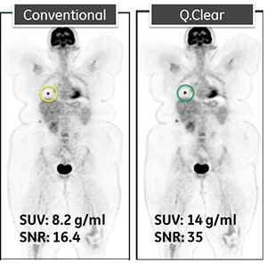 「Q.Clear」では,“逐次近似法”において画像を再構成する際に繰り返し演算を多く行ってもノイズが増大しないよう,アルゴリズム内にノイズをコントロールするための新たな演算式を組み込みました。これによって,従来相反関係にあった「画質」と「定量値」の双方が向上し,一貫性のある“SUV”を提供でき,継時的な治療効果判定へのPET利用が可能となります。