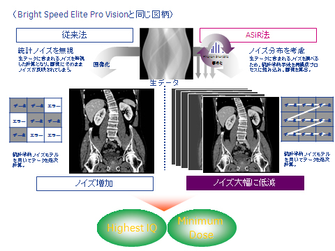 PET/CTとして初めて全く新しいCT画像再構成法「ASiR」を導入。CT画像上に発生するノイズ量やその分布特性の統計的解析結果を画像再構成のプロセスに組み込むことで,飛躍的な画質向上を実現し被曝の低減を可能にしました。