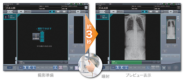 曝射後,プレビュー画像の表示は約3秒*。分割画像毎の表示ではなく,結合された状態で表示するため,即座にポジショニング状態の確認が可能です。また,次撮影可能になるまでのタイミングもわずか約10秒*²と,正面側面撮影もスムーズに遷移可能,高速ワークフローを実現します。