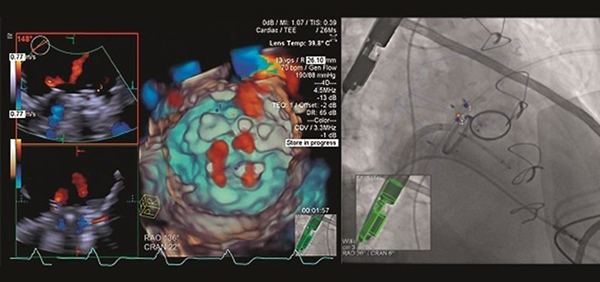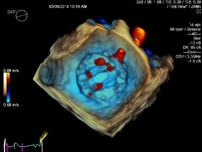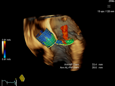 僧帽弁・大動脈弁を含む広範囲の3D画像や血流情報を加えた3Dカラードプラを心電図同期なく,リアルタイムに描出します。画像取得時の呼吸コントロールが必要なく,術後の弁周囲逆流の評価なども瞬時におこなえ,より安全で確実な施術に貢献します。