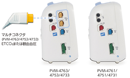- マルチコネクタ(PVM-4763 / 4753 / 4733に搭載)にケーブルを接続するだけでパラメータを自動認識,ETCO2 / 観血血圧の測定が可能になります。わずらわしい設定は不要です。
