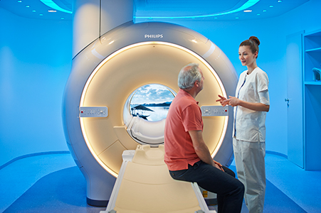 Ambient Experience(アンビエント エクスペリエンス)がIn-Bore Experience(インボア エクスペリエンス)を加えてさらに進化しました。患者さんはミラーを介して壁に配置したモニターの映像とヘッドホンからの音楽を楽しみながら,ストレスの無い検査を受けられます。モニターに表示したプログレスバーで検査の進ちょくが一目で判断でき,さらに息止めスキャンの,息を止めるタイミングをアニメーションで表示します。このようにIn-Bore ExperienceはMR検査特有の閉塞感のみならず,拘束時間に対するストレスを軽減する,本当の意味で「人にやさしい」快適でストレスの少ない環境をサポートします。