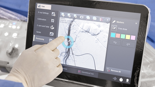 「Marker tool」は,手元の操作パネル(TSM:タッチスクリーンモジュール)上で指先やマウスを使ってライブ画像上に血管・ステント等の形状を描画することができます。画像をズーム,パンニングにも追従し,スムーズな操作性を実現します。