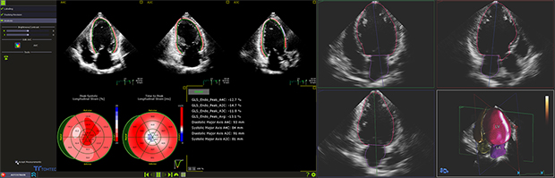 GLS(Global Longitudinal Strain) 解析を行うAutoStrain LVでは,AI技術1により解析に必要な3断面を自動選択する Smart View Selectに対応します。