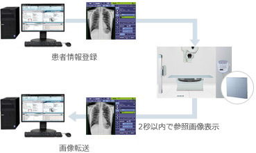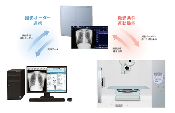 診断用X線装置との連携によりDRシステム側で選択された撮影部位・方向に応じてX線撮影条件がX線装置のコンソールに自動でセットされ,条件設定の負担を軽減します。また,撮影後の撮影実績や線量情報はDRシステム側に画像データとともに送信・保存され,情報管理が容易です。