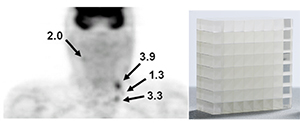 PET・CT装置の今後10年の運用を考慮すると,全身撮像だけではなく頭部撮像の重要性も増し,より高分解能画像の出力が必要となります。Isotropic(等方性)を実現する4×4 mm LSOクリスタルを使用したデータ収集は,CT やMRIと同じ512 x 512マトリクスでの画像再構成を実現しました。 全身撮像のプロトコルにおいて,頭部の収集時間を長く設定し,通常の全身画像に加え高分解能な頭部 画像出力にも対応可能です。