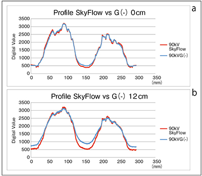 図2aのグラフはファントムの前に何もない散乱線の影響の少ないときのグラフであり,図2bがアクリル板12cmをファントムの前に置いたときのグラフである。散乱線の少ないと思われるアクリル板のないときは,グリッドを使用しないときと比べSkyFlow画像のプロファイルカーブにあまり変化は見られないが,散乱線量が増えていると思われるアクリル板12cmのときのSkyFlow画像は,縦隔の辺りで大きくコントラストが改善されている。このことより,散乱線の量によって画像コントラスト強調を調節していることが確認できる。SkyFlowは,基本的に散乱線量が多いと画像コントラスト強調を強める傾向にあることがわかる。