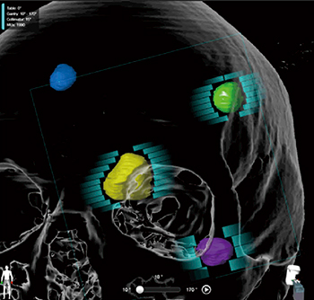 最大の特長は,単一のアイソセンターで治療計画を作成し,1つのアーク照射で複数のターゲットを同時に照射することにある(図2)。最適化は線量集中性の指標をベースになされ,正常組織の線量を最低限にする2)。1つの寝台角度につき往復2アーク,最大5つの寝台角度を設定できるため,合計で最大10アークとなる。最大治療個数は10個である。複数のターゲットが1つのMLCリーフペアの進行方向に並んでいる場合,リーフペアを大きく開口させターゲット間の正常組織を照射することはせず,必ず1つのリーフペアで1つのターゲットを照射し,反対方向,あるいは他方向からのアークでもう1つのターゲットを照射する仕組みである。