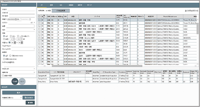 Radamèsは,検像システムQuartinaのサーバにソフトウエアとして組み込まれている。CT,核医学,血管造影,一般撮影などの画像のDICOMデータやRadiation Dose Structured Report(以下,RDSR),RISによる撮影記録をCSVファイルとして取得するなどして,検像システムを介すことで自動的にRadamèsへデータを蓄積していくことが可能である。CTは「WAZA-ARIv2」(放射線医学総合研究所)と連携するために,プロトコール名やシリーズ名とWAZA-ARIv2のスキャンタイプを紐づけしたリストを作成し,Radamèsに取り込んでいる。リストの作成を装置別に行うことで,装置に対応した実効線量を算出することが可能である。核医学は国際放射線防護委員会(以下,ICRP)のデータを基に投与量から被ばく線量を算出するため,検査と薬剤の対応表を作成して取り込んでいる。