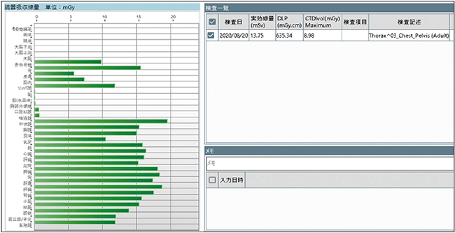 CTにおいては,WAZA-ARIv2と連携することで,各臓器の被ばく線量を解析することができ,1検査ごとに実効線量を計算することができる(図3,図4)。