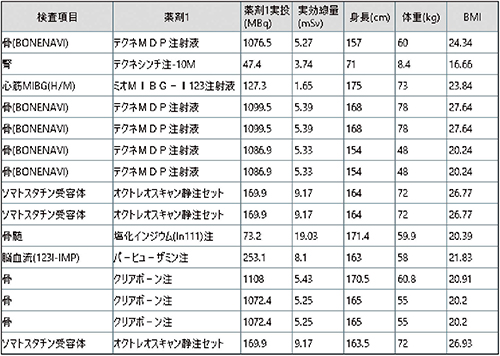 核医学の分野においては核種の半減期に基づき減衰曲線を表示し,どの程度で放射線の影響がなくなるかが視覚的にわかるようになっている。また,ICRPのデータから各検査の全身における被ばく線量を投与量から計算し,実効線量として記録している。RISから出力したCSVファイルで薬剤とその投与量を記録している(図5)。