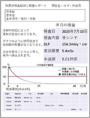 今後の展望として,検査を受けた患者に対する被ばく線量レポート(図6)を出力できるようにRISなど他システムと連携したいと考えている。線量レポートは今回受けた検査の被ばく線量だけでなく,過去1年分の検査も反映できるようにする予定である。このレポートはRadamèsから出力されるだけでなく,RISサーバや汎用画像サーバなどと連携して院内各所で出力できるように,2020年中にシステム構築したい。