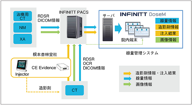 また,INFINITT DoseMは根本杏林堂社の造影検査情報管理システム「CE Evidence」と連携し,造影剤の注入情報(種類・注入量・注入速度など)も同時に管理することができる。「被ばく線量」と「造影剤」の情報管理ができることは,CTの医療安全管理において非常に有用であり,導入の大きな理由となった(図1)。
