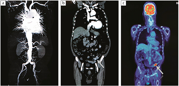 大動脈瘤精査の症例でCTアンギオグラフィが撮影された(a)。冠状断で下行結腸に濃染があり,結腸がんが疑われた(b)。後日行われたFDG-PET/CTで腫瘍に集積があった(c)。