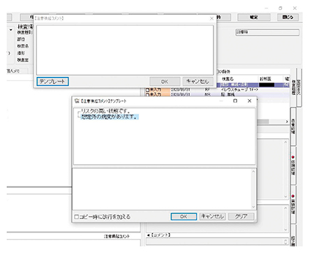 レポート入力画面で必要に応じて注意喚起コメントを入力するためのウインドウがポップアップ表示される。テンプレートをあらかじめ設定しておくことが可能。