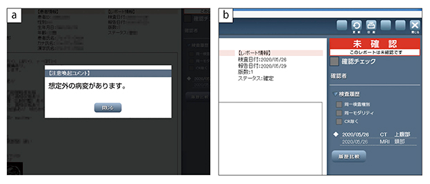 画像診断報告書を開くと,注意喚起コメントがあることを示すポップアップが自動的に表示される(a)。検査依頼医師は画像診断報告書を確認したことを電子カルテ上に記録する運用となっている(b)。