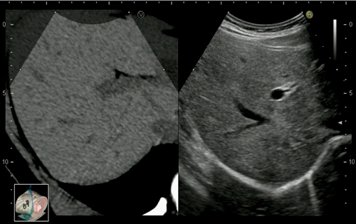 実際のRFAでは,術前のCT画像を参照しながら,超音波ガイド下に穿刺を行います。治療後,病変部の残存などの治療効果判定を造影CTで行い,不十分な場合は再治療ということになります。しかし,CTでは確認できるのに,治療時の超音波画像では見えない病変がまれにあります。また,CTと超音波の画像の断面(スライス角度)が異なっているため,術者の頭の中で三次元的に統合し,腫瘍の位置の見当を付けながら穿刺を行うという状況でした。当時のCT画像は横断像のみだったため,肋骨に沿って斜めに観察する超音波画像と対比させて腫瘍の詳細を把握することができず苦労していました。