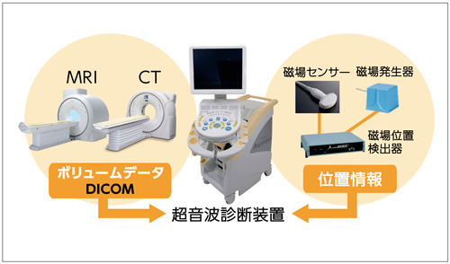 CTやMRIの画像をDICOM形式で取り込み,リアルタイムの超音波画像と