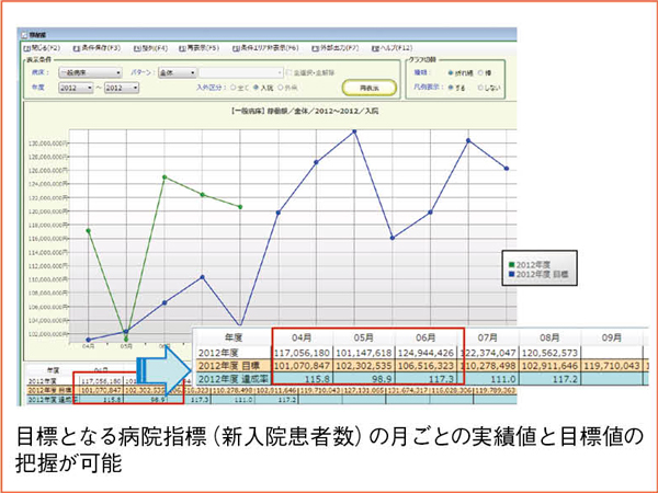 もうひとつは,医事のデータをもとに“意思決定”が可能なデータを提供することです。具体的には「目標管理」が可能な機能を提供できることです。目標管理は企業では当然のことですが,診療報酬という,いわば公定価格で事業を遂行している多くの医療機関においては,意外と取り組まれていません。“前年の医業収入の何%アップ”をめざせと言われても,現場としては具体的な行動に移しにくいからです。EBISでは,過去3年間の医事データから実績を解析し,目標とする増収のためには1週間に入院患者を何人増やせばいいのかという,具体的なデータを提示できます。医事データという実績を根拠とし,さらに行動した結果を確認できることは,スタッフの安心感や自信に繋がり改善のサイクルが回るようになります。