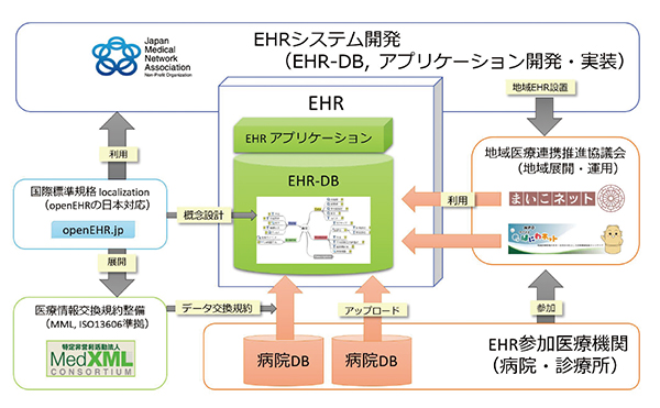 図1にJMNAのサービス提供体制を示す。それぞれの地域ごとのEHRの運営は地域の協議会に任されており,JMNAはデータの相互互換性(interoperability)を担保したEHRシステムを提供する。実体としての診療情報は国内のクラウドサービス上に設置されたデータセンターに蓄積されるため,病院などデータ提供施設から見ると,EHRに収納されたデータは災害時であっても最低限の診療を継続するための参照用バックアップとなる。図2にシステム構成を示す。参加医療機関からは,日次のバッチ処理で当日の診療情報がMML(Medical Markup Language)由来のデータフォーマットでデータセンターにアップロードされる。アップロードされたデータは,国際標準規格(openEHR archetype)準拠のデータモデル2)にマッピングされてデータベースに格納される。患者ユーザーは,協議会のホームページからログインして自身の診療記録を閲覧できる。医師ユーザーは,パソコンに協議会から発行された証明書をインストールすることで,病院内にいるのと同様に担当患者の診療記録を閲覧できる。
