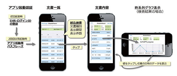 図3にiDolphinViewerの画面遷移を示す。ユーザーナビゲーションを向上させるため,画面遷移はすべて3層以内の階層しか持たない。アプリを起動すると,始めにアプリ起動用のパスフレーズを求められる。起動用パスワードには,ホームページから閲覧する時に用いるEHRログインID,パスワードとは異なる任意のパスフレーズを設定できる。EHRログインID,パスワードは,アプリの初回起動時にアプリに登録することができる。アプリが起動すると,始めに診療文書一覧画面が表示される。文書種別や表示件数は,画面上部をスワイプすることで絞り込むことができる。文書を選択すると中身が表示される。特に,検査結果の場合は,検査項目をタップすると,当該項目の時系列の履歴がグラフ表示される。現在,対応している文書種別は,処方と検査結果である。
