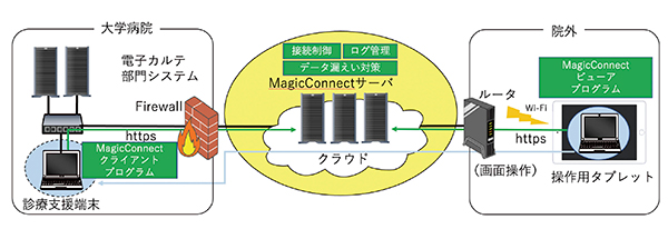 構築したシステムの概要を図1に示す。本システムでは,診療支援端末および接続するタブレット端末(iPad)にMagicConnectのクライアントプログラムをインストールし,診療支援端末からMagicConnectのクラウド上のサーバへhttps通信することで,院外のタブレット端末から院内の診療支援端末に接続することが可能となる。細かい設定は,MagicConnectのクラウドの管理画面で行うことができる。Magic Connectのクラウドの管理画面では,管理者が許可するタブレット端末からのみ利用を許可し,Windows OSの端末からの利用を禁止した。また,院内にウイルスが侵入するリスクを低減するため,クリップボードを介したコピー機能を禁止するとともに,システムの利用状況画面から,システムの利用状況を一括して確認することができる。