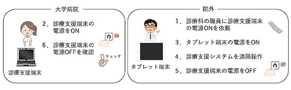 本システムは,濃厚接触者となり自宅待機になった職員が自宅から診療を継続して行う必要が生じた場合を想定して整備したものである。当院では,院外から診療情報の参照・記載を許可することは初めて試みであった。そのため,システムの利用範囲を限定し,個人情報保護および注意事項の順守を示す申請書・誓約書の提出をもって利用を許可することになっている。システムの利用が許可されると,診療支援端末の予備機および遠隔接続するための操作用タブレット端末をセットにして希望部署に提供している。操作用タブレット端末のBYOD(Bring Your Own Device)は禁止し,Window OS端末ではなくシステム管理者によって機能制限が施された操作用タブレット端末(iPad)を提供している。