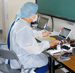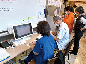 当初,COVID-19の濃厚接触者となり自宅待機になった職員向けに提供するために本システムを整備していたが,自宅待機になる職員が利用する事態には至ってなく,本システムが利用されていないことは幸いなことである。一方,COVID-19の感染者の増加に伴って,ドライブスルーPCR検査場のPCR検査やCOVID-19患者宿泊施設への往診を当院が支援することになり,これらの施設から電子カルテシステムを利用したいという希望があり,本システムが利用されるようになった。これらの業務を通して,本システムが有効活用できることが確認され,今では必要不可欠な存在となっている。ドライブスルーPCR検査場およびCOVID-19患者宿泊施設における利用の様子を図4と図5に示す。