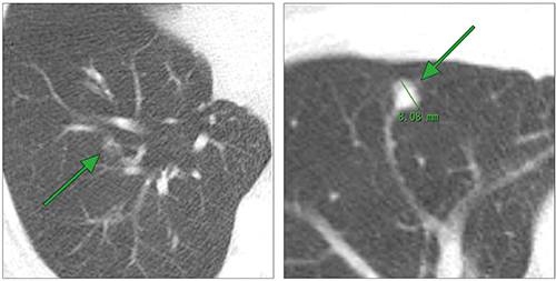 したがって,このような小結節では,薄層スライスによる高分解能CT(HRCT)による精査が実施される体制が整備されていれば適切な判定が行われるが,5 mmスライス厚での肺がんCT検診によるフォローアップではその判定に懸念が残る。
