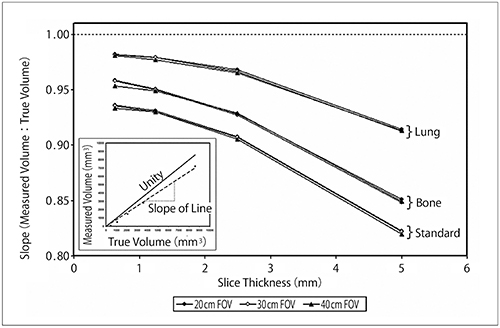 実際の読影においても,5mm以上の病変を検出することは多くの経験論からも否定されるものではないが,図2に示すように,小結節におけるすりガラス影部分と部分容積効果によるすりガラス影の区別が困難な症例が発生し,充実成分の大きさの評価は不十分と想定される。これに対しPrionasら6)は,充実性病変を模擬したファントムを用いてCT画像上の体積計測精度を検証し,真の体積に対しスライス厚の増加とともにCT画像上の体積が小さくなることを報告している(図3)。また,「1.CTDIvol“2.5mGy”の妥当性」の項目で参考とした3つの標準プロトコルでは,スライス厚は2.5mm以下と規定され,いずれも1.0mm以下を推奨している。