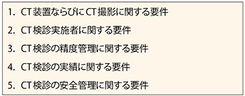 CT検診の安全管理に関する要件は,検診施設として管理体制が組織化されていることである。CT装置は保守契約が結ばれ,専門業者により定期的に実施され,使用者側には始業・終業時の点検が実施された記録が保存されていることである。