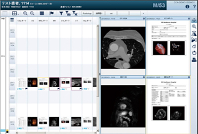 ベンダーに縛られないオープンかつ国際標準規約(IHE XDS準拠)に則ったVNA構築をサポートします。院内外のさまざまなシステムに別々に保存・管理されているDICOM画像のみならず,心電図,各種検査情報,さまざまな仕様の紙媒体(同意書や検査レポートなど)やデジタルカメラなどで撮影された画像などを一元管理することで,効率的なデータ管理や各部門におけるシステムのコスト低減を図ることができます。また,一元管理されたデータは,Centricity Universal Viewer ZFP(Zero Foot Print)により診療情報を網羅的に参照することができます(図1)。