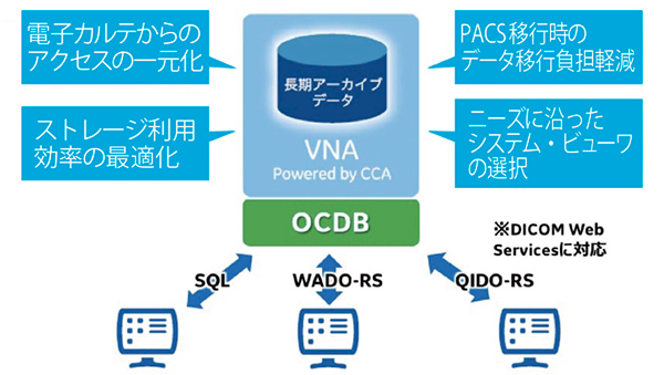 OCDBは,VNAに保存されている画像データをSQLで柔軟に検索ができるよう,他社ビューワに公開したデータベースを言います。接続したシステムと高速にアクセスできるよう,DICOM Web Serviceにいち早く対応しています(図2)。OCDBには次のようなメリットがあります。