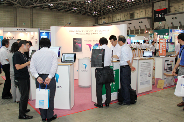 ファイルメーカーブースでは,昨年と同様にFileMakerを使った医療システムやソリューションを開発するパートナー(FBA)を集めて展示を構成した。今年の出展パートナーは,両備システムズ,マキシステム,ジェネコム,キー・プランニング,ジュッポーワークス,スプラッシュ,フォーサイト,イエスウィキャン。