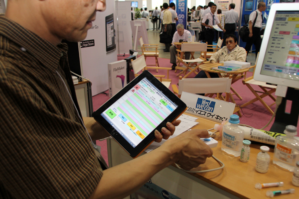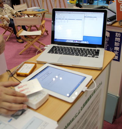 イエスウィキャンは,バーコードとiPadを使った認証システムのソリューションを展示した。名古屋記念病院副院長でJ-SUMMITSのメンバーでもある草深裕光氏が,FileMakerで開発したシステムで,ブースでは草深氏自らが来場者に説明していた。同院では,ウルトラモバイルPCとバーコードリーダーを使って,透析の際のダイアライザーと患者認証を3点チェックする仕組みを構築して運用していた。今回,iPad2とBluetoothのバーコードリーダーの組み合わせにバージョンアップし,作業の効率アップと安全性の向上に繋がっているという。