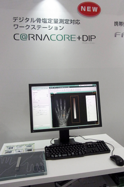 また,富士フイルムは,7月13日にデジタル骨塩定量測定サービス「+DIP」の提供を発表したが,ブース内にもデモンストレーションが行われた。X線画像をクリニック向け医用画像診断ワークステーション「C@RNACORE」でダイレクトに計測する。このサービスは,7月から本格的に始まったクラウドサービス「ASSISTA Portal」による従量課金制での利用ができる。そのため,導入施設は安価に導入可能である。なお,このASSISTA Portalは,従来手がけてきた地域医療連携サービス「C@RNA Connect」などもサービス内容としている。