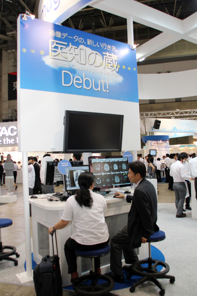 GEヘルスケア・ジャパンは,医用画像のデータホスティング・サービスである「医知の蔵」のプロモーションを中心にブースを構成した。医知の蔵は,同社のPACS導入先を対象に医療機関に保存されている画像情報を,外部のデータセンターに保存,管理するサービス。GEのPACSでは,画像データを3〜5年以内の短期ストレージと,それを超えた長期アーカイバーに分けて保存しているが,医知の蔵では,まず長期アーカイバーのデータの外部保存を対象にサービス提供を開始する。データセンターには,ソフトバンクテレコム(株)の設備を利用する。