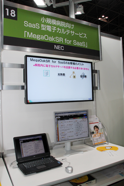 NECは,電子カルテシステム「MegaOakHR」,小規模病院向けネットワーク(SaaS)型電子カルテサービス「MegaOakSR for SaaS」をメインとする同社の医療ソリューションと,シーエスアイ,日本事務器など関連企業の最新の製品,システムをあわせて展示を構成した。