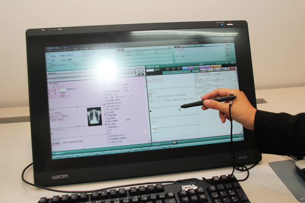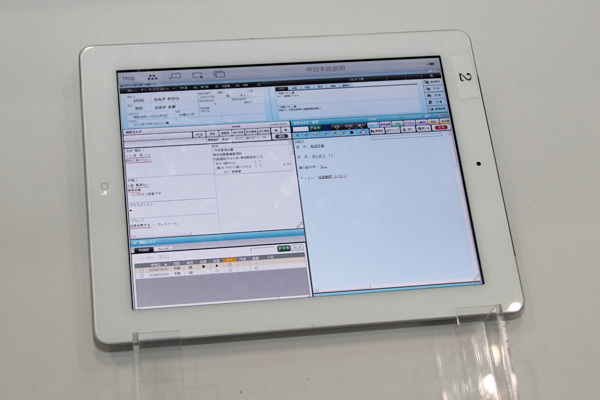 今年の展示では,ワイド型液晶,タッチペンタイプ,高精細モニターとの2画面構成など,さまざまな画面構成が可能なことをアピール。また,iPad2と連携して,クリニックの電子カルテにリモートでアクセスしてカルテの閲覧などが行え,在宅医療や訪問診療,自宅でのカルテ入力などに対応する機能を紹介した。