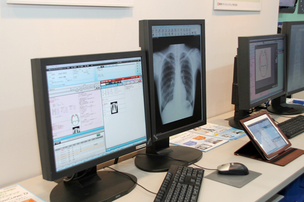 島津メディカルシステムズ/島津製作所は,無床診療所向け統合型電子カルテシステム「SimCLINIC T3」を中心に展示を行った。 SimCLINIC T3は,使いやすさと業務の効率化を可能にする統合型の電子カルテで,医用機器メーカーである島津の実績を生かして画像ビューワまで統合されているのが特長である。