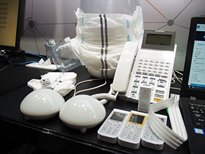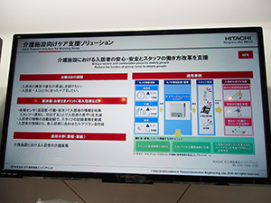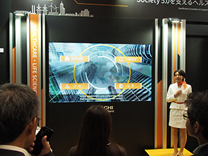 展示会場では,各分野の社会イノベーション事業の最新の実績や取り組みを紹介した。ヘルスケア・ライフサイエンスの展示は,「デジタルとデータが牽引するヘルスケアイノベーション」と「医療の未来を拓く再生医療」をテーマに構成された。ビジネスセッションで紹介されたAIによる画像診断支援の取り組みをはじめ,粒子線治療ソリューション,デジタル手術支援ソリューションなどを紹介。新ソリューションとしてアピールされた「介護施設向けケア支援ソリューション」(日立情報通信エンジニアリング)は,入居者の排泄や室内の温湿度,移動・接近などの情報を集約,通知,蓄積し,適切なケアの支援やスタッフの負担軽減を図る。各種センサからの情報はBLE受信機(ランプ)で受信し,電話線を介して「日立データコレクションIC2000」に集約,内線電話機やランプ,アプリに配信されるため,施設内に既設の電話線を利用でき,導入コストを抑えることができる。