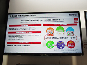 また,さまざまな業務にAIを活用する新コンセプト「AIプラス」も参考展示した。医療・介護分野への展開として,スマートフォンで食事の写真を撮るとAIがメニューを自動判別し,食品成分・栄養素を自動算出する開発中のシステムを紹介した。病院や介護施設,栄養ケア・ステーションなどでの栄養指導業務の効率化支援などを想定している。