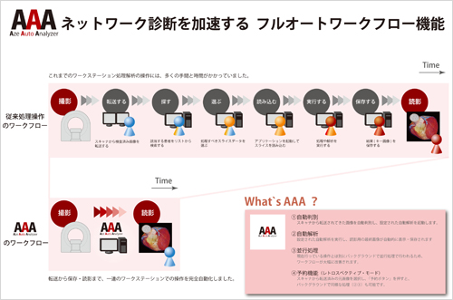 作業時間を短縮するために解析処理の自動実行機能“AZE Auto Analyzer”(AAA)を実装しました。ユーザはAZE Auto Analyzerの条件設定画面で,対象データと対象機能を設定します。すると,CTから画像を受信したAZE VirtualPlaceでは,自動的に上記条件との確認が行われ,その条件が満たされる場合は,条件に設定されている対象機能が自動的にバックグラウンド処理されます。ユーザは患者リスト画面で処理の完了を確認して,解析結果を参照するだけで,手動操作を行うことなく対象データの解析を自動的に完了できます。 【画像クリックで拡大します】
