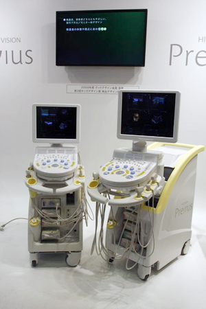 超音波では,高画質技術をコンパクトにパッケージした「HI VISION AVIUS(ハイビジョン アビアス)」を展示。アビアスは,昨年グッドデザイン賞金賞を受賞した「HI VISION Preirus」の機能やデザイン,コンセプトをコンパクトに集約している。幅45p奥行き70pのボディに,Pure ImageやFine Flow,Real-time Tissue Elastographyなど高画質化技術を搭載する。 |