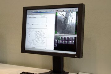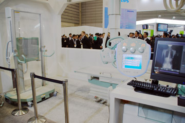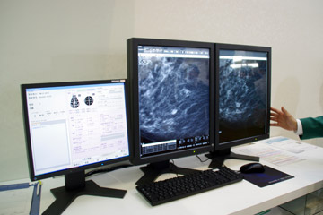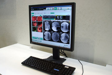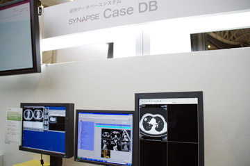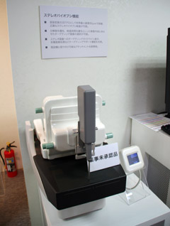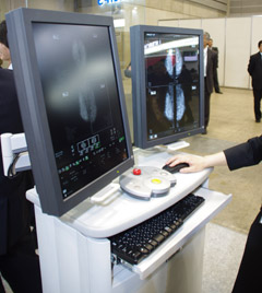 このほか,DRでは,CALNEOシリーズの上位ラインである直接変換方式FPDを搭載した「FUJIFILM DR BENEO」も改良を図った。今回のITEMでは,長尺撮影に対応しており,さらに検査の適応が広がった。また,デジタルマンモグラフィの「AMULET」もコンソール「AWS」のモニタに5Mピクセルの高精細モニタを奢るなど,ブラッシュアップしている。モニタ変更や過去画像との比較表示などにより,診療放射線技師が撮影画像を支援し,正確な検査施行が行える。また,マンモグラフィ用の読影ビューワ「マンモVIEWER」や,参考出品としてAMULETと組み合わせるバイオプシーも紹介していた。