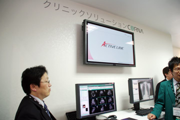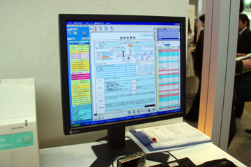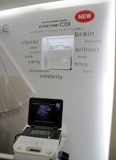 DRコーナーの一角には,超音波装置のコーナーも設けられた。2006年後半に超音波装置に参入した富士フイルムは,独自の“ZONE Sonography”技術を搭載した製品をコンスタントに市場に送り出している。今回は,今年5月に発表が予定されている「FAZONE CB」を出品した。ポータブルタイプの同装置は重量が4kg。内蔵バッテリでは1時間駆動する。患者さんの目に触れることを意識して,光沢のあるパールホワイト塗装がされている。12.1インチ型液晶と大型ボタンで扱いやすい。病院でのベッドサイドや設置場所が限られた診療所などでの使用が考えられるという。 |